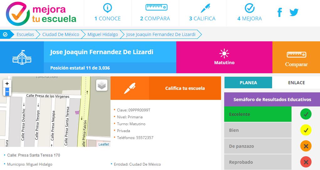 Con gusto les compartimos que el portal Mejora tu Escuela nos otorga una calificación de EXCELENTE en su medición de resultados educativos. Que el gran equipo que formamos colegio-padres-alumnos sobre todo en beneficio de éstos últimos, siga dando frutos para otorgarles las herramientas para su desarrollo personal y profesional.